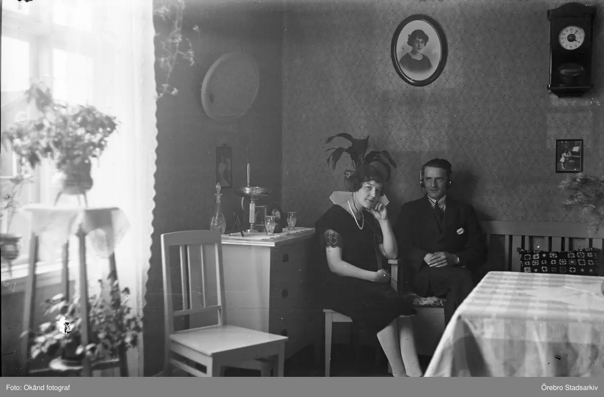 Kvinna och man som lyssnar på radio med kristallmottagare, 1926