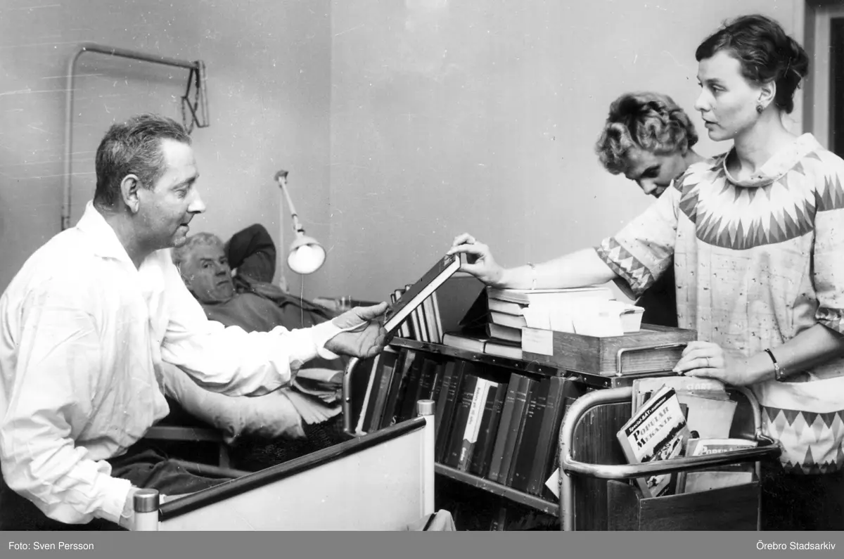 Bibliotekarie ger bok patient på Regionsjukhuset , 1970-tal