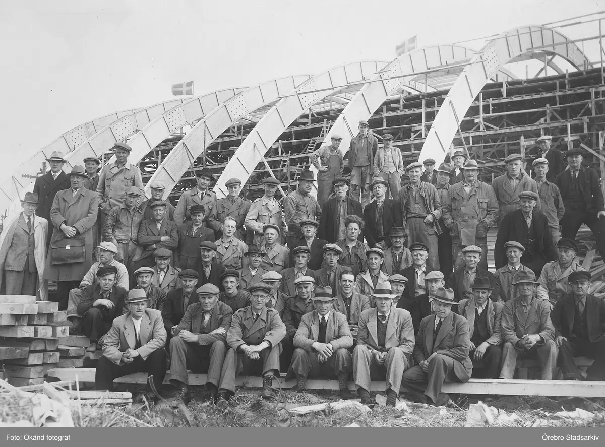 Byggnadsarbetare framför byggnationen av idrottshuset, 1945