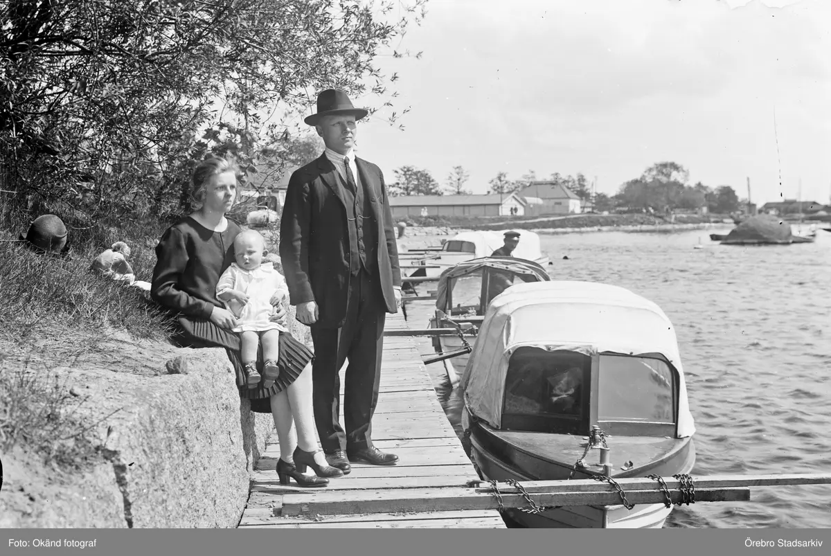 Familj vid Skebäck småbåtshamn, 1920-tal