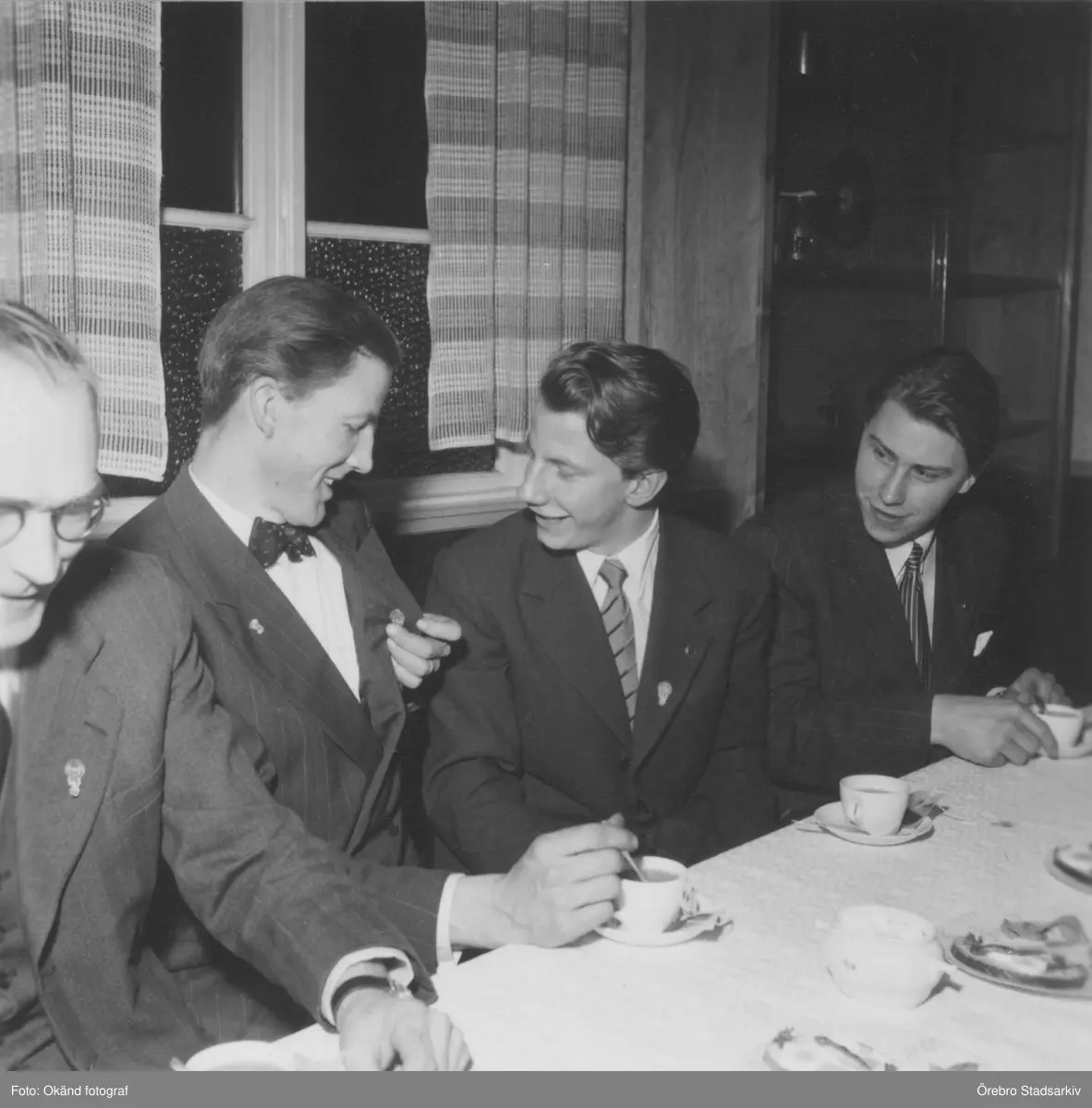 Glada herrar i kostym vid JUF:s 25-årsjubileum i Vintrosa, 1954