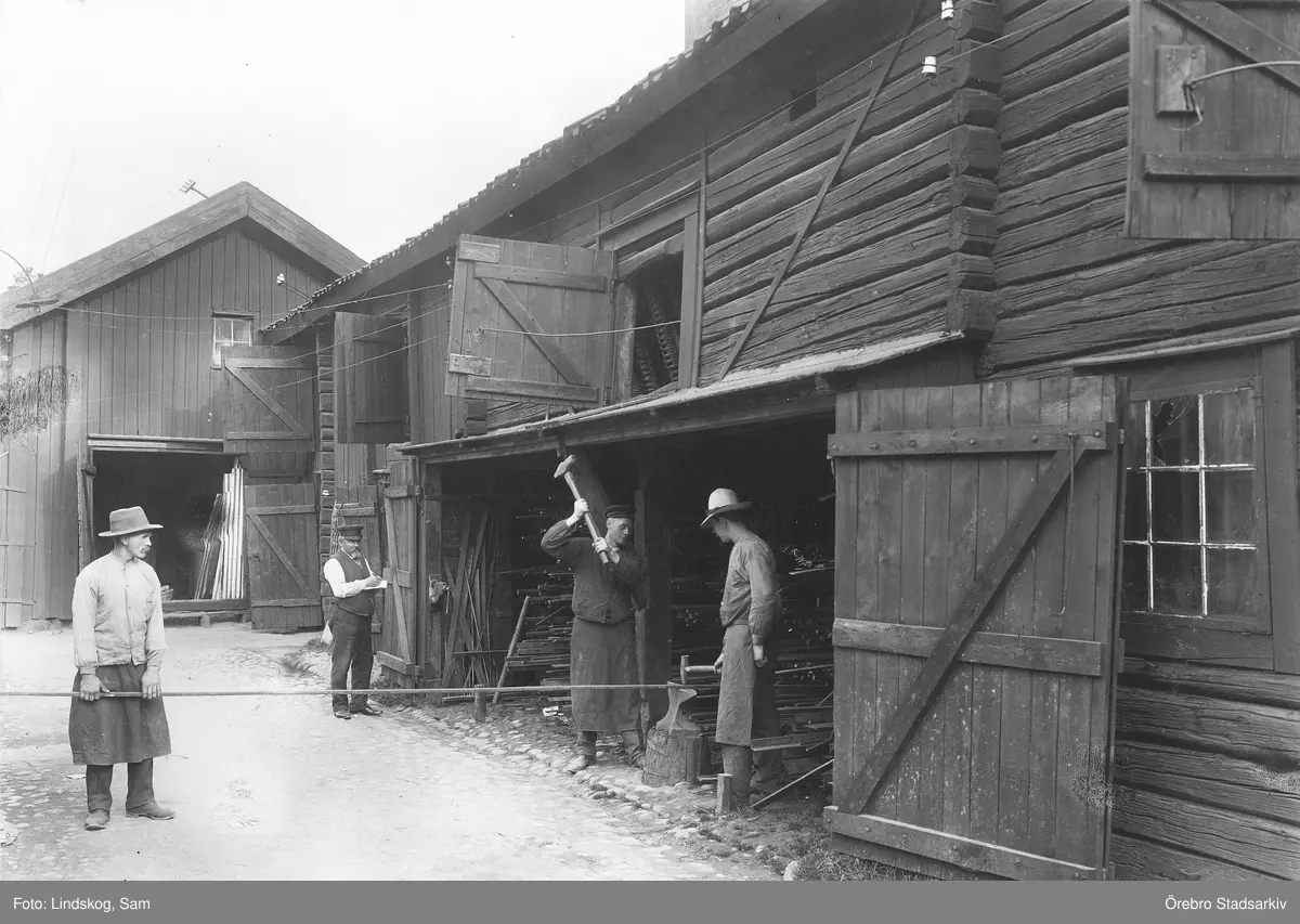 Magasinskarlar hugger av järnstänger, P O Jonssons järnhandel, Södra Strandgatan 5, 1912