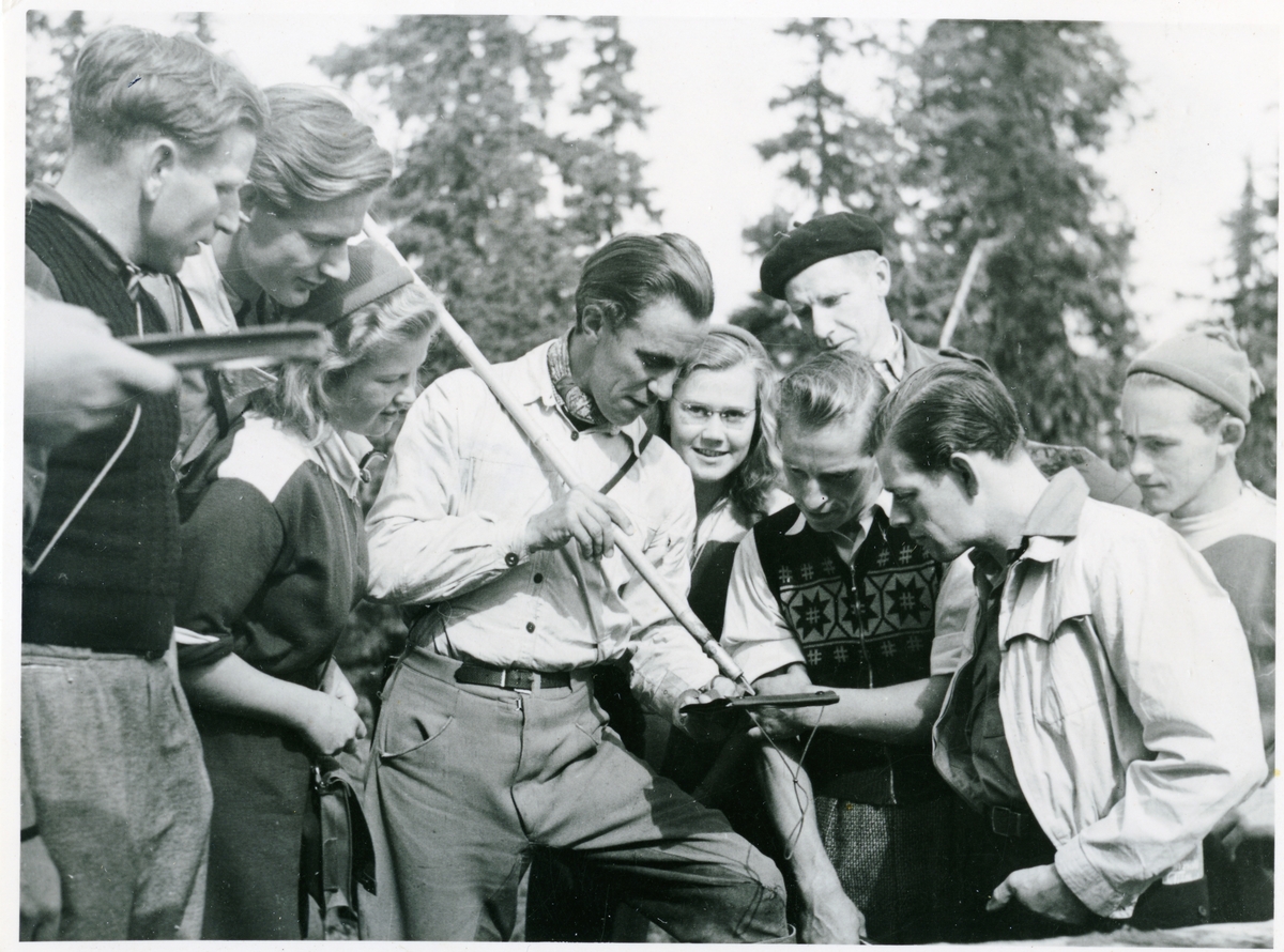 IOGT-ungdomar på läger tittar på när man pekar ut något på en karta (troligen).
