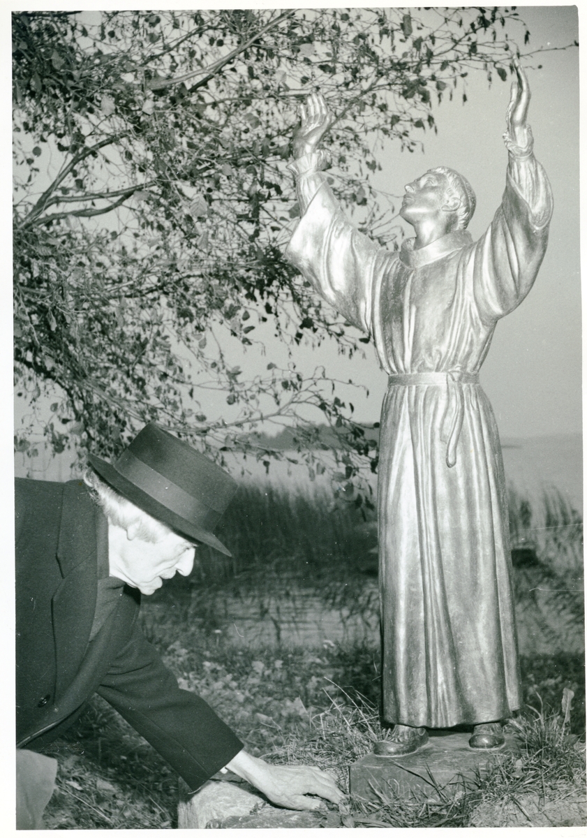 Bildhuggaren Carl Eldh vid sin staty "Ansgar".