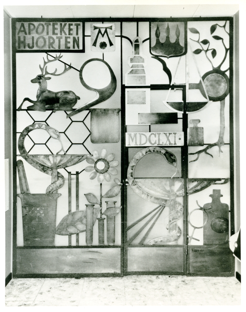 Dekorerad dörr och vägg i Apoteket Hjorten, c:a 1900.