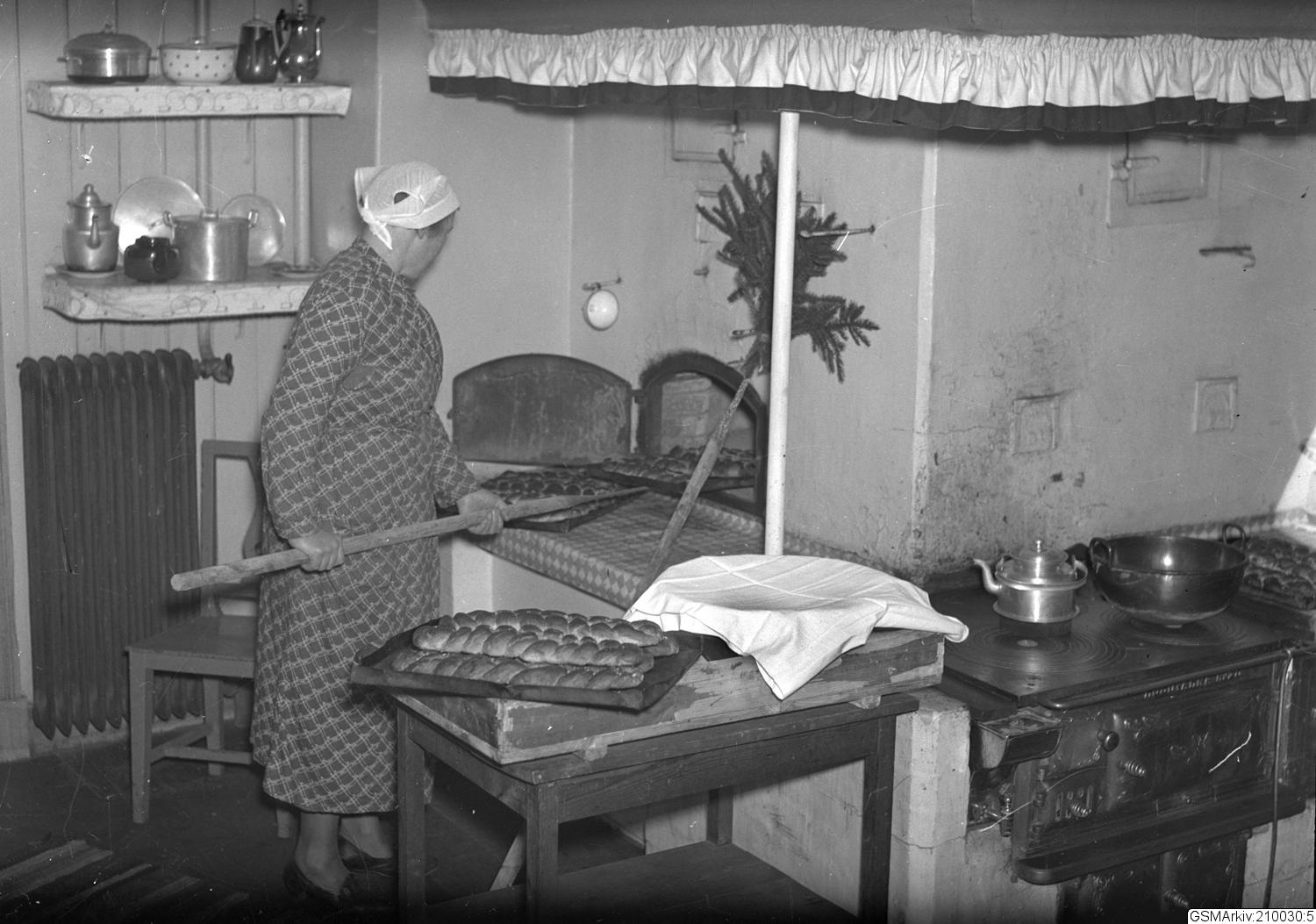 Julbak 1937, kvinna bakar bröd i vedeldad bakugn.