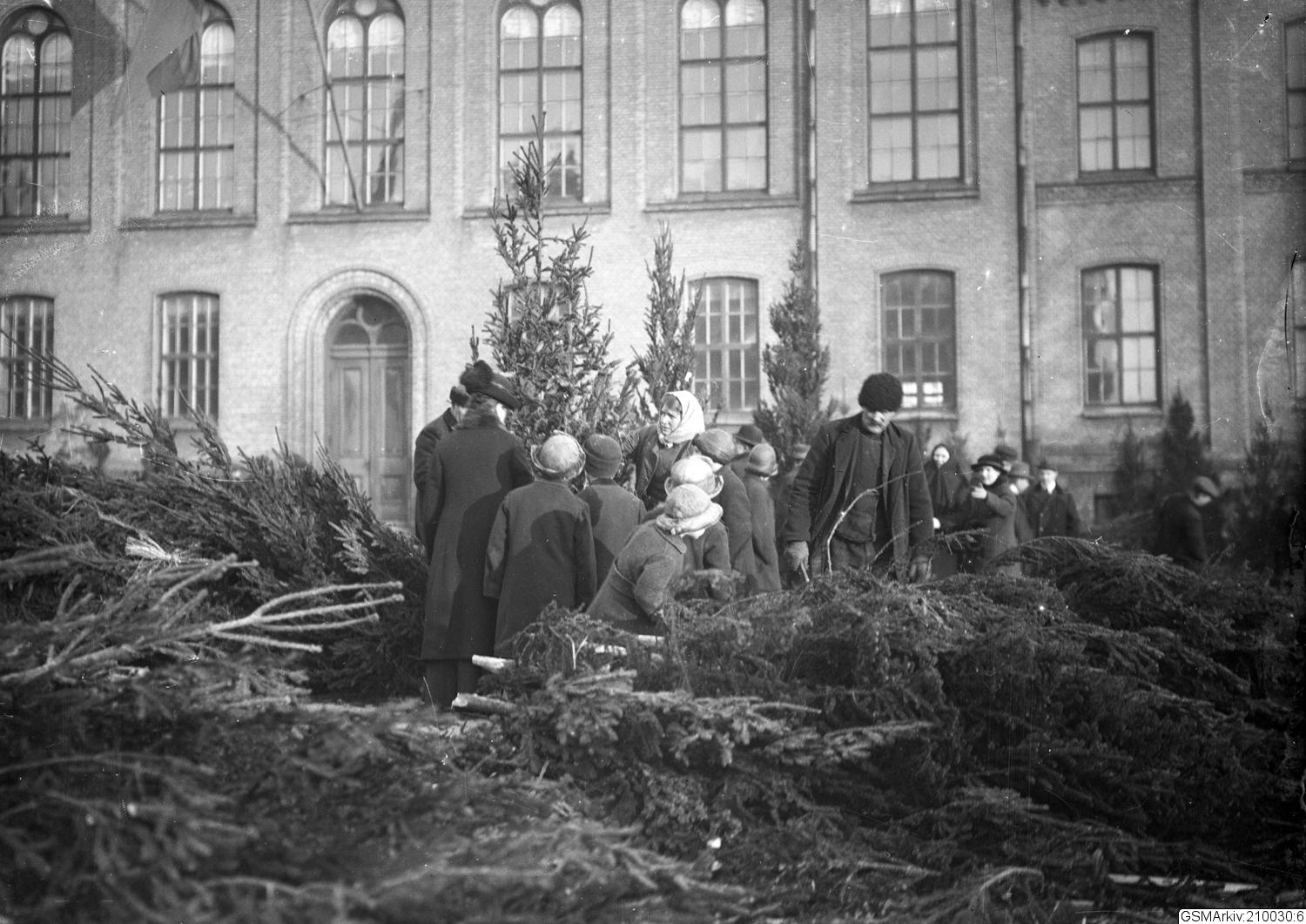 Julgransförsäljning vid Hvitfeldtsplarsen dagen före julafton. I bakgrunden Högre latinläroverket, Hvitfeldtska gymnasiet.