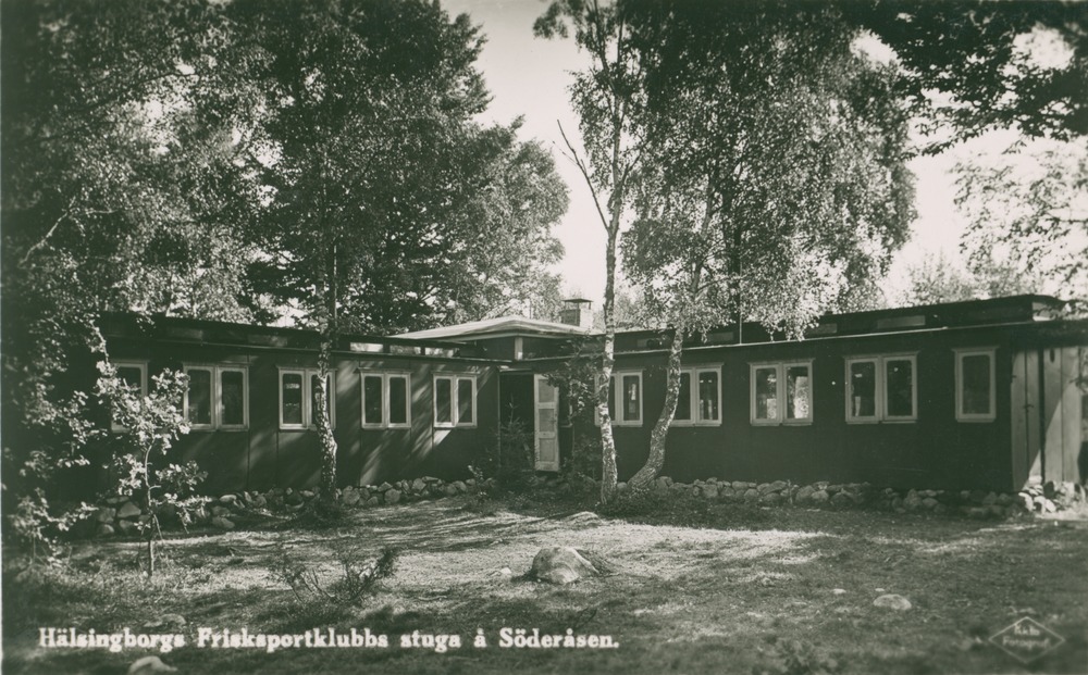 Svartvitt fotografi från 30-talet, föreställande Hälsingborgs frisksportsklubbs stuga på Söderåsen. Stugan byggdes av en boggievagn från SJ som klubben köpte för 100 kr. Vagnen delades i två delar och byggdes ihop på mitten till ett klubbhus med övernattningsmöjligheter. I Svens memoarer kan man läsa om bygget på sidan 21 ff.