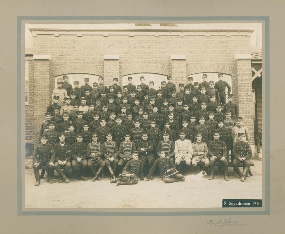 Svartvitt monterat fotografi av 5 sqvadronen 1916 i Helsingborg.