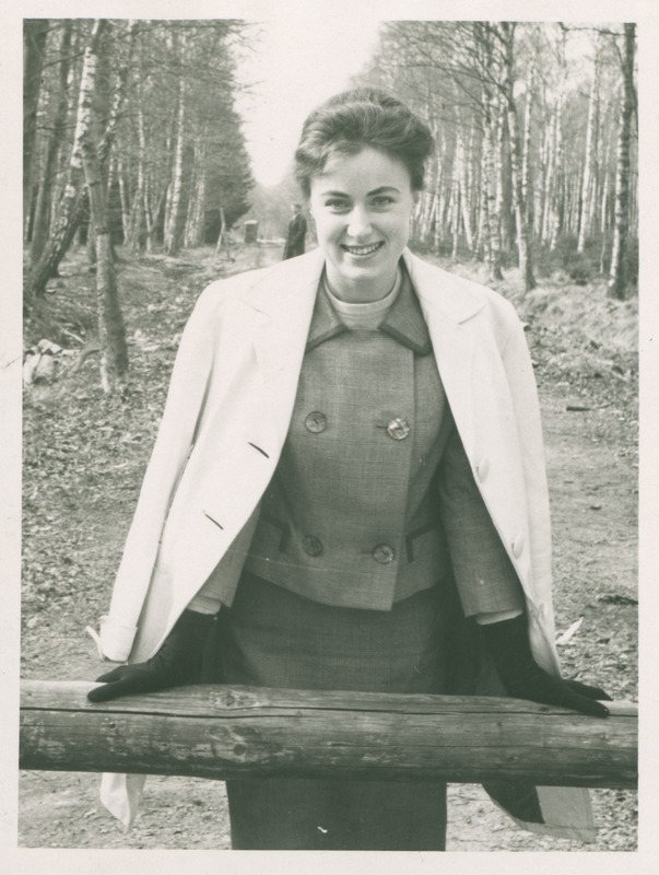 Svartvitt fotografi från 1964 föreställande Anita Lindberg på promenad i Allerumsskogen. Anita är iklädd dräkt, handskar och har en ljus kappa över axlarna.