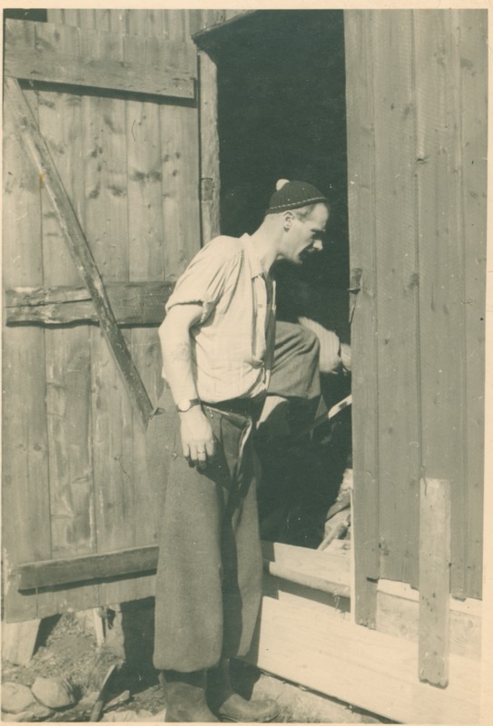 Svartvitt fotografi från tidigt 40-tal, föreställande Sven Johansson vid byggandet av Hälsingborgs frisksportsklubbs stuga på Söderåsen. Stugan byggdes av en boggievagn från SJ som klubben köpte för 100 kr. Vagnen delades i två delar och byggdes ihop på mitten till ett klubbhus med övernattningsmöjligheter. Sven står framför en öppen port och tittar in, iklädd tidstypiska friluftskläder. I Svens memoarer kan man läsa om bygget på sidan 21 ff.