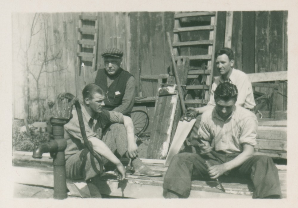Svartvitt fotografi från tidigt 40-tal, föreställande byggandet av Hälsingborgs frisksportsklubbs stuga på Söderåsen. Stugan byggdes av en boggievagn från SJ som klubben köpte för 100 kr. Vagnen delades i två delar och byggdes ihop på mitten till ett klubbhus med övernattningsmöjligheter. I Svens memoarer kan man läsa om bygget på sidan 21 ff. Fyra män sitter framför bygget, Sven sittande nederst till vänster.