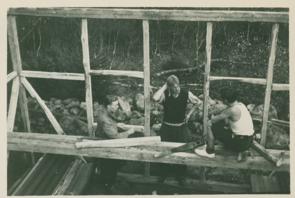 Svartvitt fotografi från tidigt 40-tal, föreställande byggandet av Hälsingborgs frisksportsklubbs stuga på Söderåsen. Stugan byggdes av en boggievagn från SJ som klubben köpte för 100 kr. Vagnen delades i två delar och byggdes ihop på mitten till ett klubbhus med övernattningsmöjligheter. I Svens memoarer kan man läsa om bygget på sidan 21 ff. Två okända män är med på bilden.
