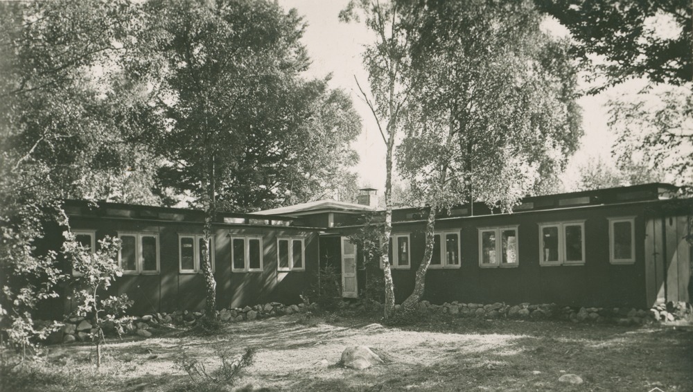 Svartvitt fotografi från tidigt 40-tal, föreställande Hälsingborgs frisksportsklubbs stuga på Söderåsen. Stugan byggdes av en boggievagn från SJ som klubben köpte för 100 kr. Vagnen delades i två delar och byggdes ihop på mitten till ett klubbhus med övernattningsmöjligheter. I Svens memoarer kan man läsa om bygget på sidan 21 ff.