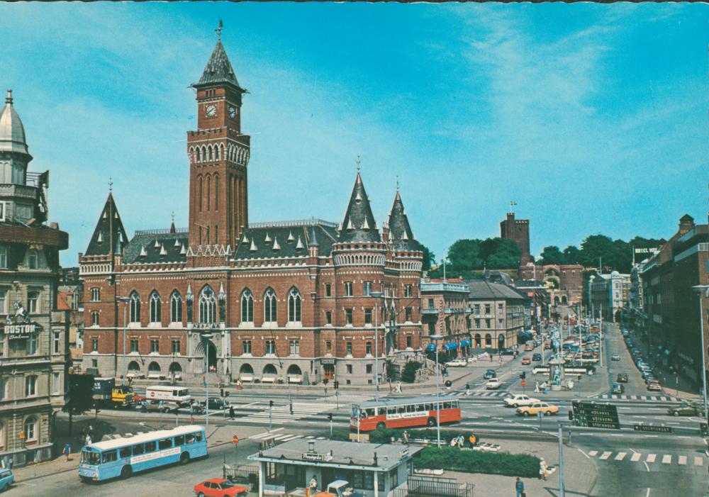 Vykort föreställande Helsingborgs centrum med Stortorget, Hamntorget, Rådhuset, Järnvägsgatan och Kärnan.