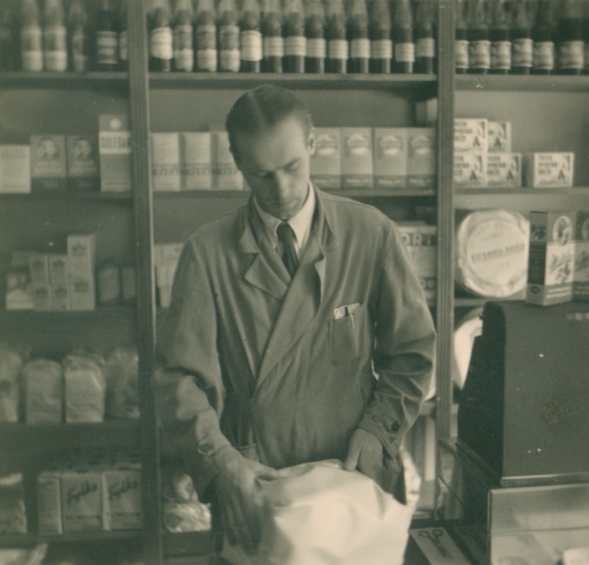 Svartvitt fotografi från tidigt 40-tal, föreställande Sven Johansson vid disken i sin butik Frisksport-Centralen, som låg på Bruksgatan i Helsingborg. I butiken såldes hälsokost, litteratur, träningsredskap med mera. Sven är upptagen med att packa in varor i papper, han är iklädd arbetsrock ovanpå kostymen. Bakom honom syns hyllor fyllda med hälsokostvaror.