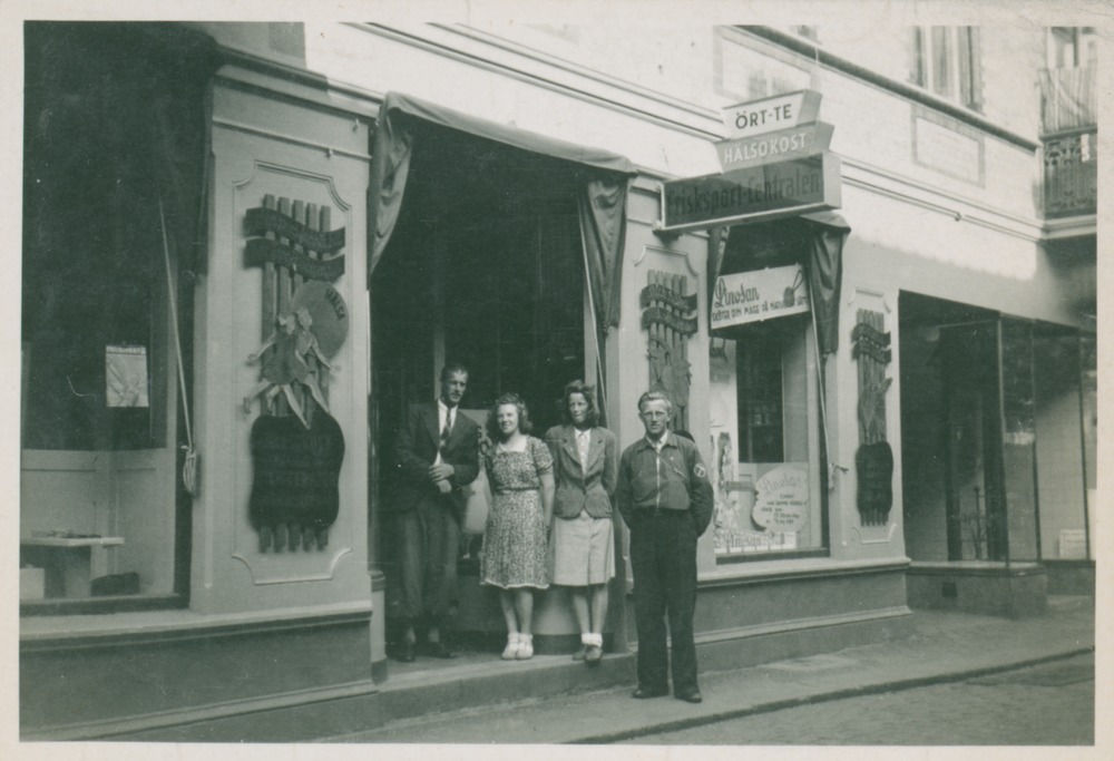 Svartvitt fotografi från tidigt 40-tal, föreställande Sven Johanssons butik Frisksport-Centralen, som låg på Bruksgatan i Helsingborg. I butiken såldes hälsokost, litteratur, träningsredskap med mera. Utanför butiken står fyra personer, Sven längst till vänster.