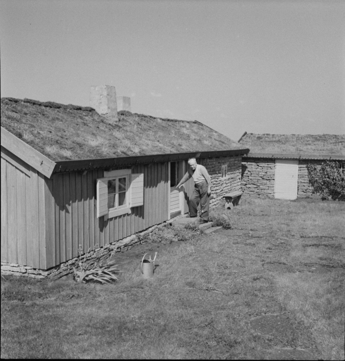 Fil dr Knut Hagberg (Svenska Dagbladet) interiör o exteriör, Hagbergs stuga på Alvaret. Hagberg själv