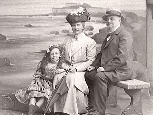 Familjebild, kvinna och man med flicka sittande mot fond med Varbergs fästning. (Se även bildnr MR2_1034)