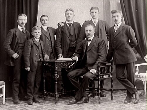 Sex ynglingar står vid en något äldre man, kanske en far med sina söner.