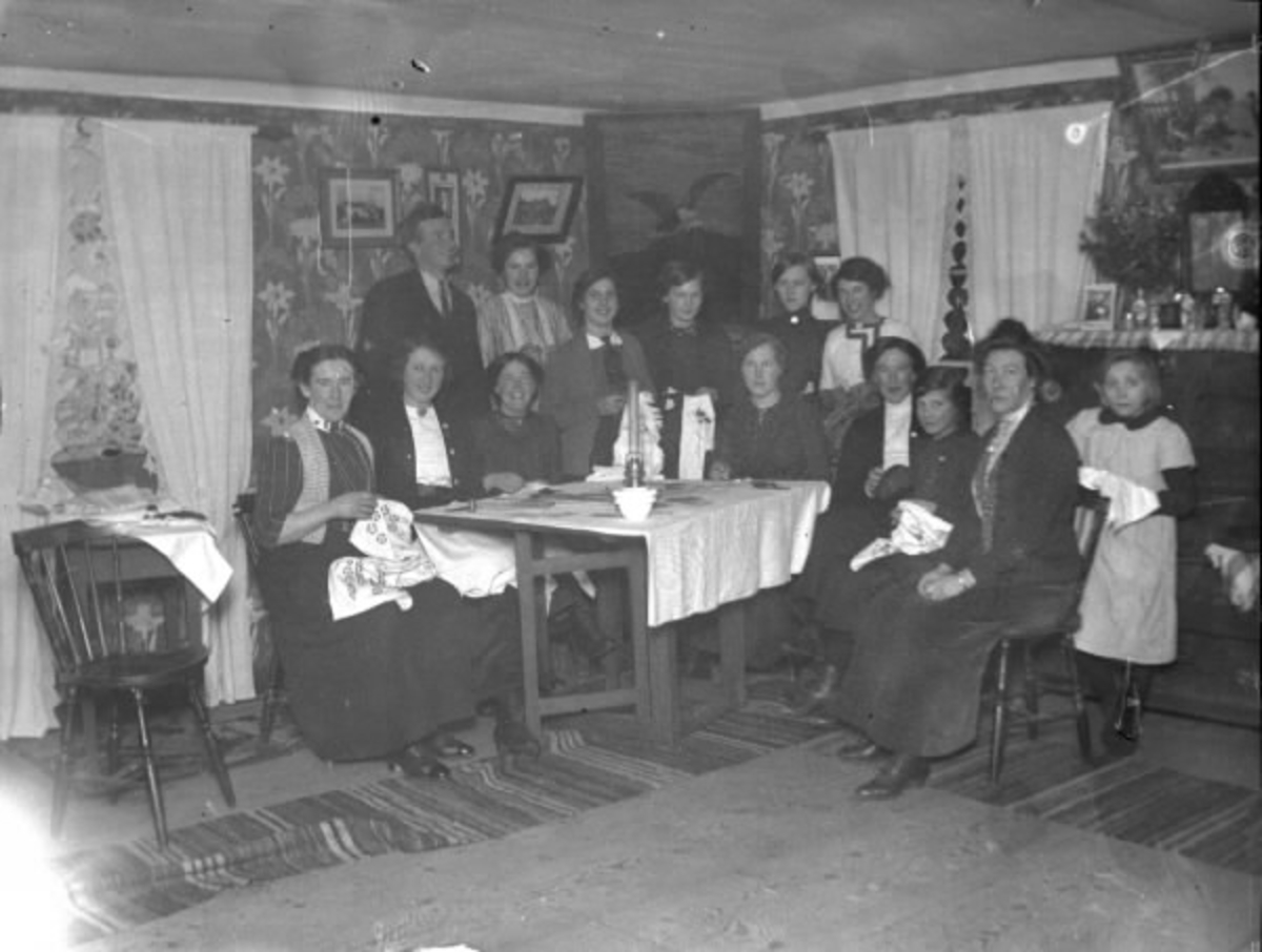 En grupp kvinnor vid ett bord. Några av kvinnorna håller i i handarbeten. Syjunta? En flicka står intill de vuxna. Även hon håller något slags handarbete. Interiör från bostad.