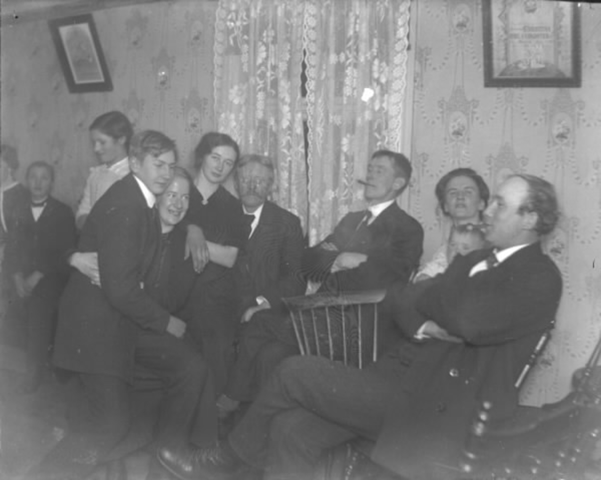 Kalas med folk som sitter utmed en vägg i salongen. En man röker och en yngling sitter i knät på en äldre kvinna, kanske hans mor.