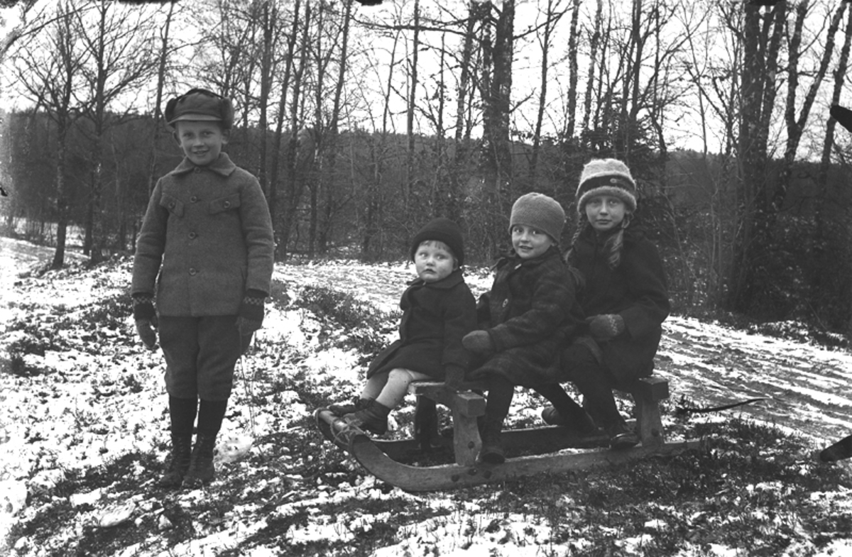 Fyra barn utomhus vid en skogsväg där tre sitter på en kälke och en pojke står bredvid. Märken täcks av ett mycket tunnt snölager.