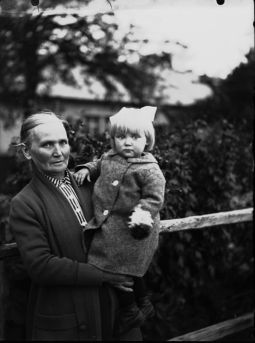 Gruppbild av Fina Galtabo, Drängsered, med dotterdotter Britt på armen i utomhusmiljö. 1900-tal.