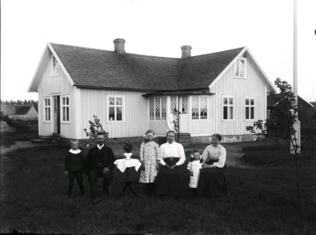 Göran Johansson, Emil Johansson, Alfrida Johansson, Gärda Johansson, Karin Johansson samtliga Näs i utomhusmiljö framför ett hus med vacker veranda.