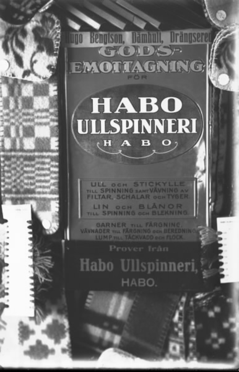 "Reklamskylt innehållande texten: ""Godsmottagning för Habo Ullspinneri""."