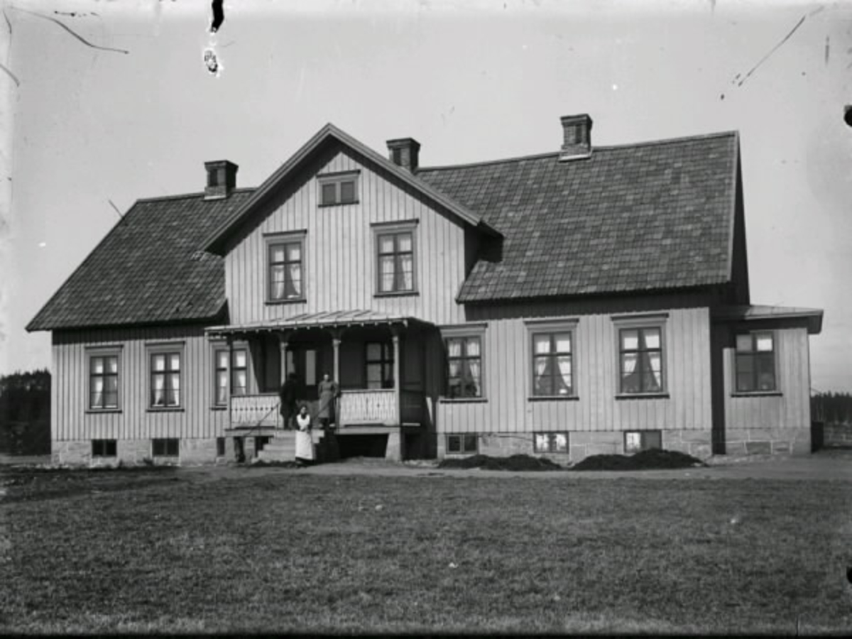 Exteriör av fattighuset Nyhem i Drängsered. Ett stort trähus på stenfot med stora spröjsade fönster och veranda med figursågat räcke, där tre personer står, troligen ur personalen.