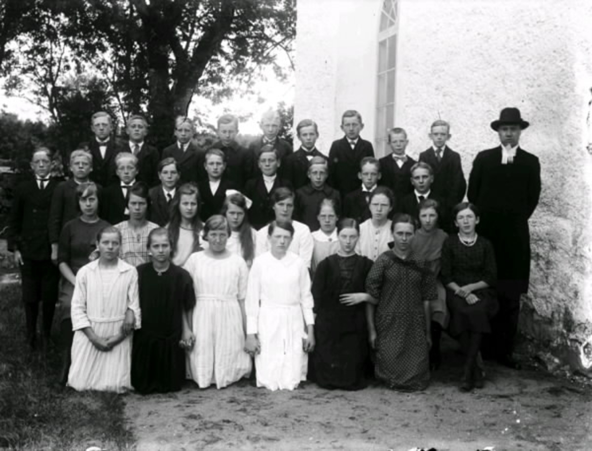 Konfirmandgrupp med prästen Bror Andersson, Tränshult, utanför kyrkan.
