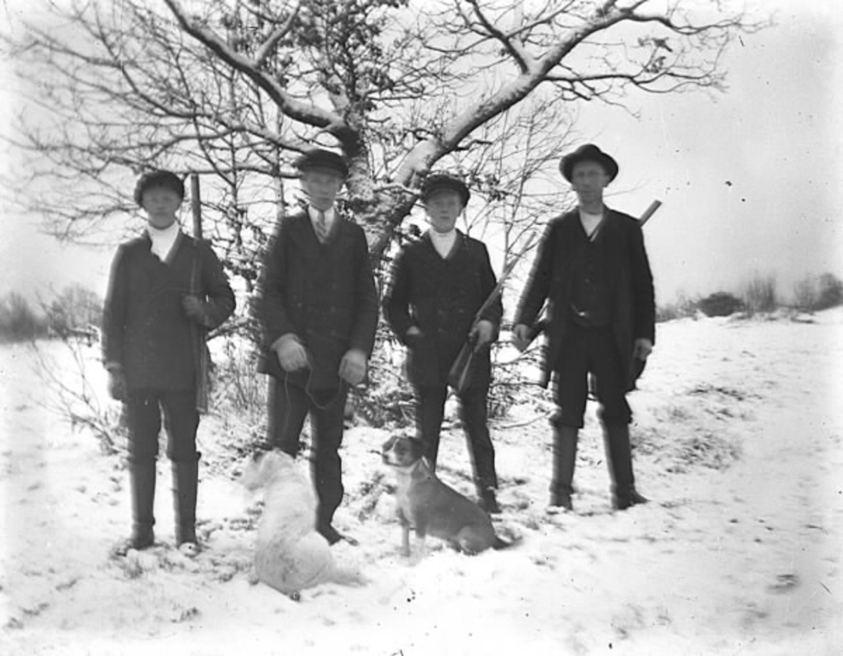 Gruppbild av ett jaktlag med hundar. Tre av männen har gevär. Vinterbild med snö.