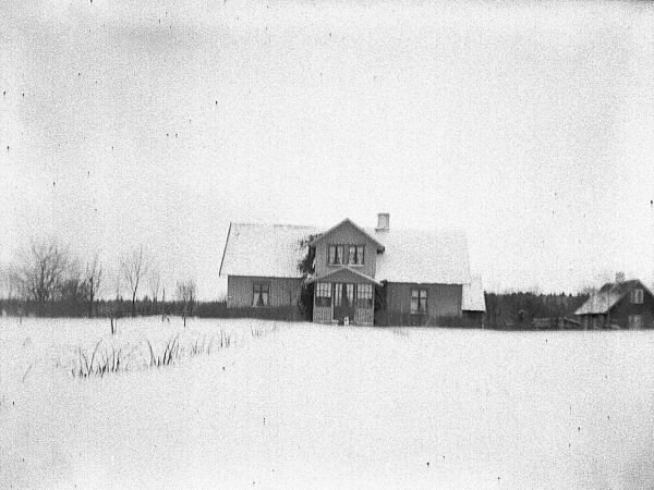 Mangårdsbyggnad i snö med fler byggnader i bakgrunden.