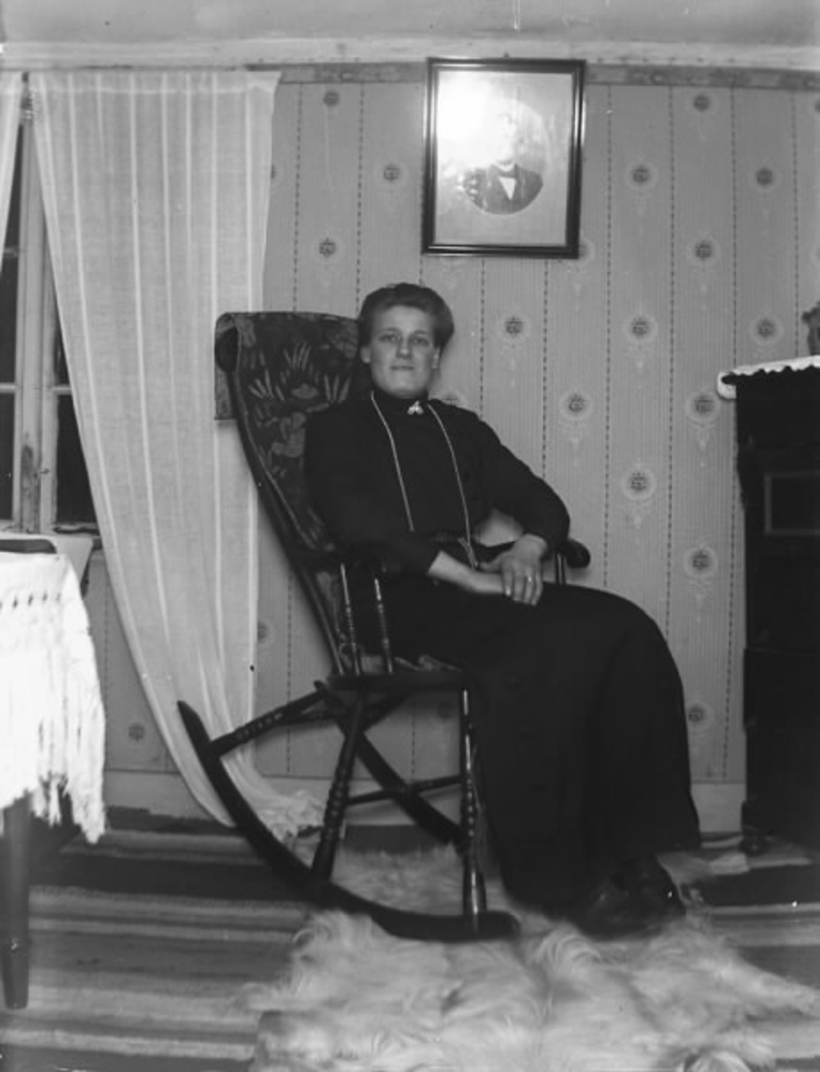 Interiörbild kvinna i gungstol, kvinnoporträtt.
