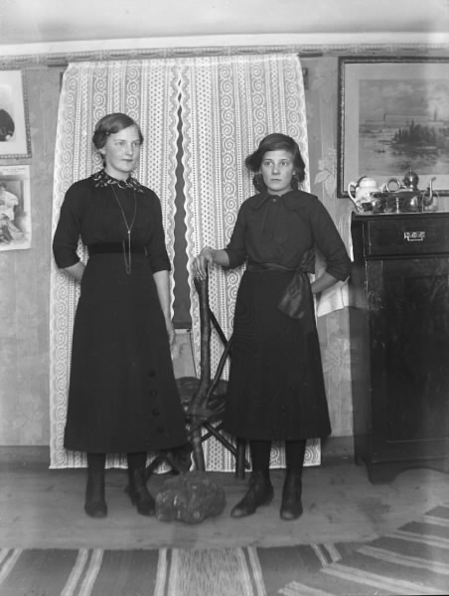 Två unga finklädda flickor framför en spetsgardin. Interiör från rum med trasmattor på golvet. Se även bild HB 513