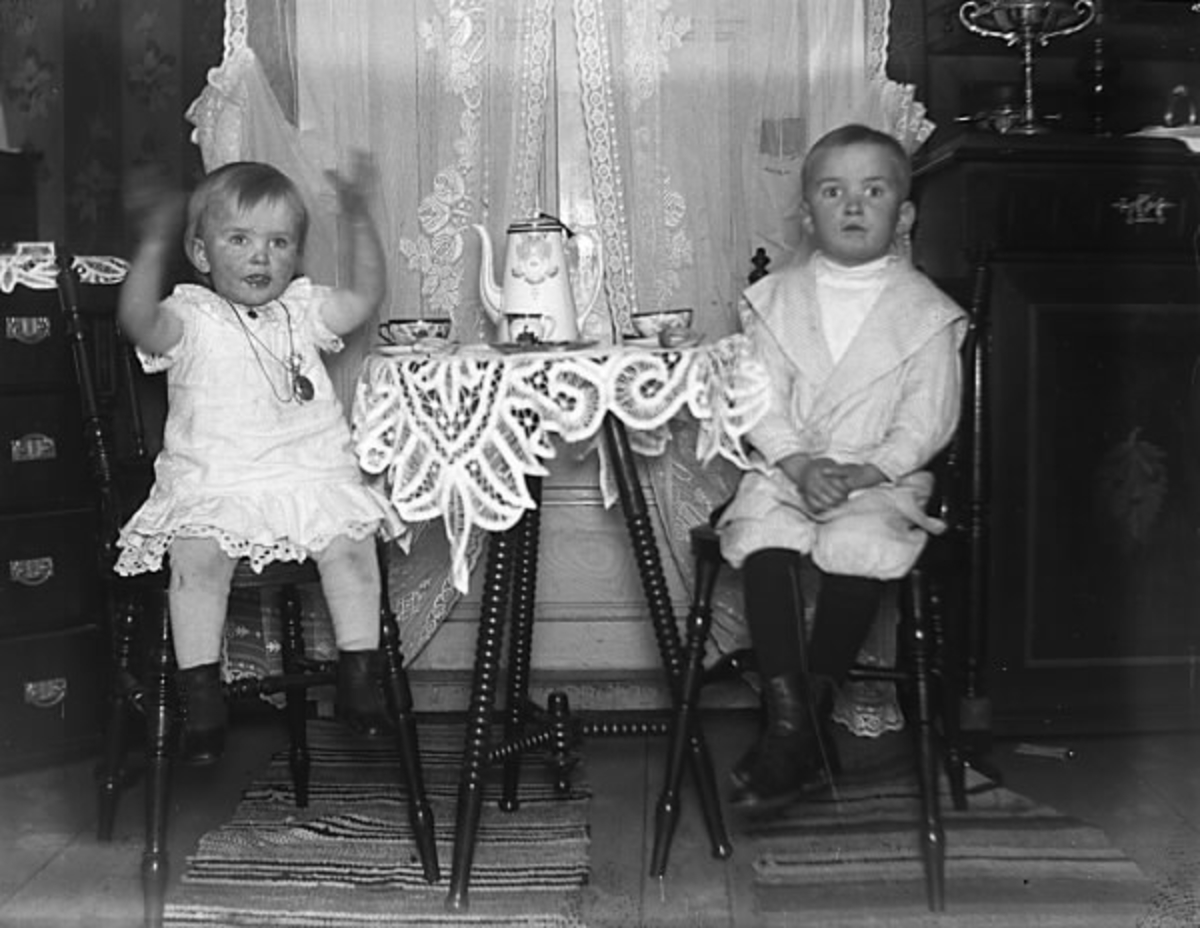 Två barn, troligtvis en pojke och en flicka, sitter på varsin pinnstol med ett vacker dukat bord mellan sig.