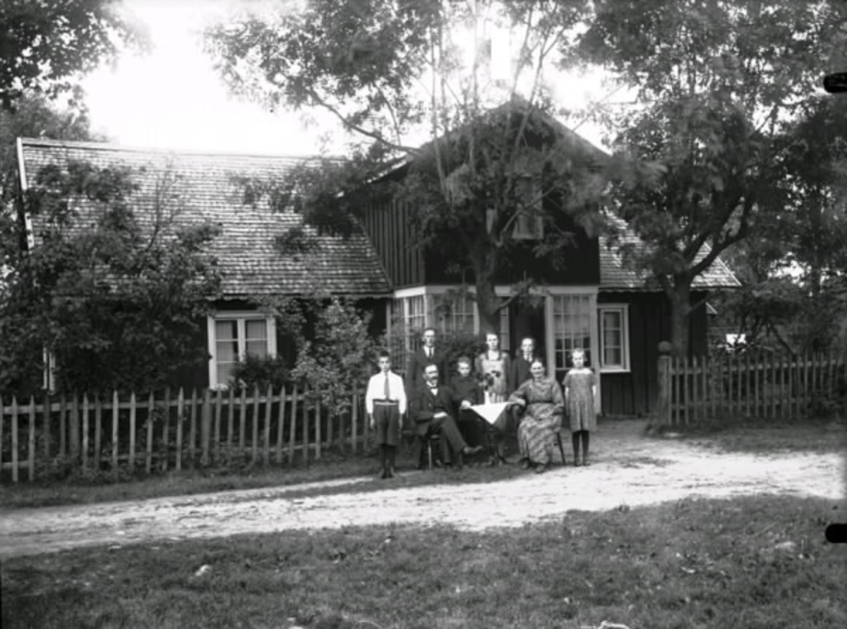 En samling personer (familj?) framföör ett hus i Brännilt, Krogsered socken.