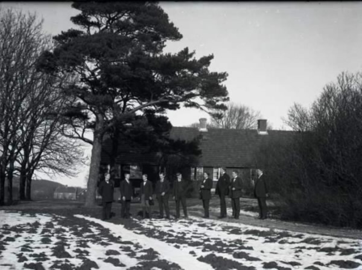Unga män, studenter i kostym och fluga, vid Katrinebergs folkhögskola med Larsagården i bakgrunden.