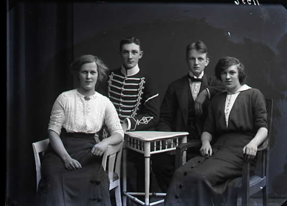Gruppbild av två kvinnor och två män. En av männen bär uniform, ateljébild,