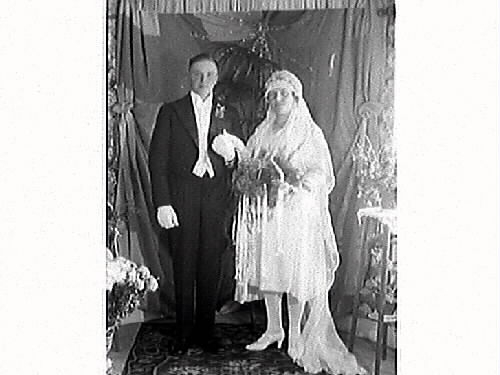 Bröllopsbild. Brudpar i helfigur och bröstbild. Augusta Bengtsson Vallby, Veddige beställde bilden och är troligen bruden.