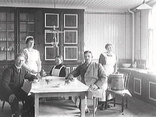 Personal vid Öströö säteri samlade i köket där männen dricker kaffe. Mannen till vänster är Daniel Selvén och till höger sitter Helge Karlsson. Vid bordet sitter Daniels mor Augusta Selvén och kvinnan som står med kopparkitteln heter Dagmar Karlsson. Kvinnan till höger på bilden står med en glassmaskin framför sig.