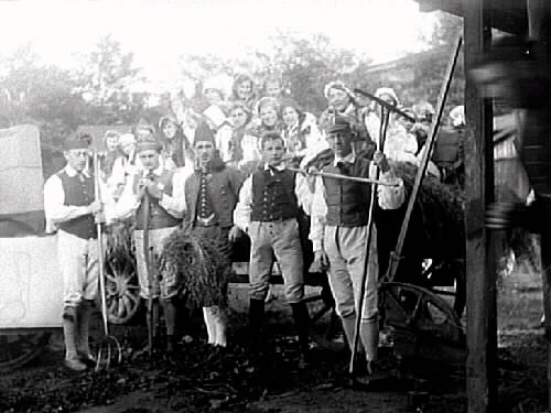 Folkdansare uppställda framför en vagn. Männen i förgrunden håller i grepar och räfsor.