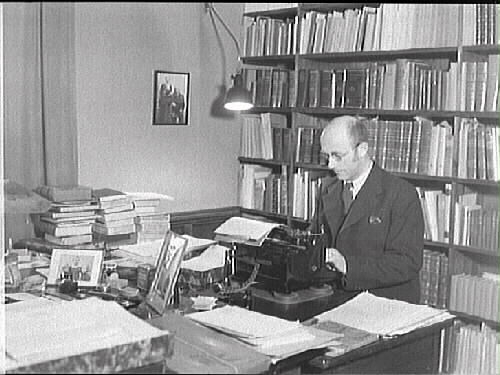 Museichef Albert Sandklef på kontoret i sin bostad i artillerikasernen på Varbergs fästning. Han sitter vid skrivmaskinen på skrivbordet, som är belamrat med böcker och dokument, med bokhyllor bakom sig.
