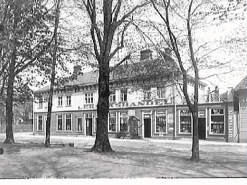 Mauritz P Lundhs färgaffär i hörnet Drottninggatan-Kyrkogatan. På fasaden över skyltfönstren står det "Leksakshandel" och till vänster "Tapethandel". Bild 2 visar fotografiet i original medan Bild 1 har gjorts till julkort genom att fälla in en tecknad tomte som bär på just leksaker i en låda på axeln.
