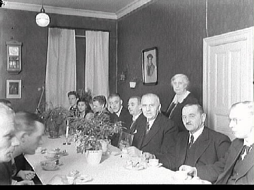 Sockenmöte. Getteröns inkorporering med Varberg firas nyårsafton 1941 i Varbergs församlingshus. Från vänster: cykelarbetaren Erik Weddig, Getterön med fru, cykelarbetare Erland Bengtsson, Getterön, hemmansägaren Hugo Arvidsson, Getterön, dr Erik Uddenberg, Varberg, överläkare Gustav Fransson, Varberg, rådman Gustav Berndtsson, Varberg samt rektor O. Edlund. Stående: fröken Hilda Svensson, Varberg. Fotograferat i Församlingshemmet kv Kyrkoherden 3, Varberg.