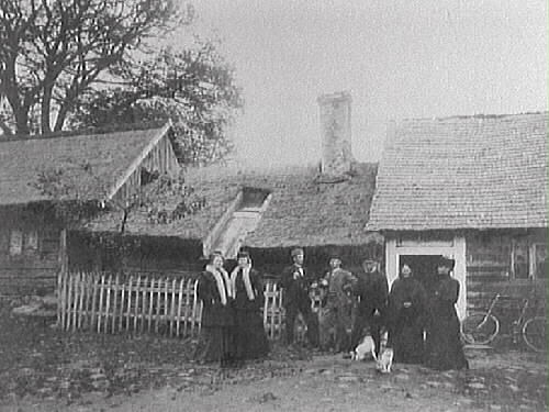 Högloftstugan kallad Vippentorpet i Ysby, Laholm. I mitten själva bostaden med spis, en ryggåsstuga, och på ömse sidor högre loft med ingångar även till stugan. En samling personer står framför stugan, en cykel står lutad mot fasaden och ett staket framför bostaden skyddar sannolikt en rabatt längs fasaden.