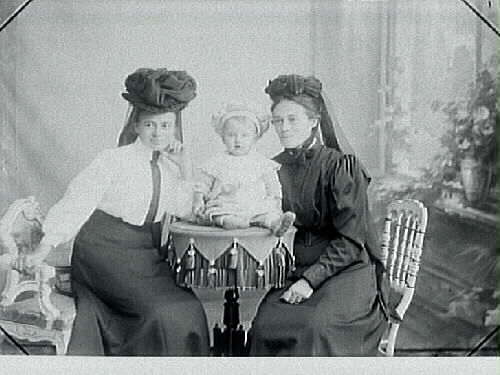 Porträtt av två kvinnor sitter med ett litet barn på ett bord mellan sig, beställt av Karstorp. Troligen är det tre generationer. Kvinnorna bär ovanlig mörka hattar med slöjor baktill.