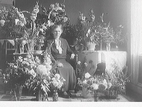 En äldre kvinna, fru Bengtsson, Pensionatet, sitter omgiven av ett stort antal blomsterbuketter. Födelsedagsfirande.