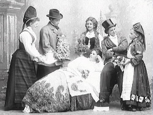 Scen, eller "tablå", där en på divan halvliggande kvinna (Nathalia Ranch) uppvaktas med bl a kaffebricka och spettkaka. Till höger om Hulda Ranch/Lindh med kakan står Berta Ranch och Mathilda själv. Kvinnan t v bär Rättviksdräkten, populär vid tiden.